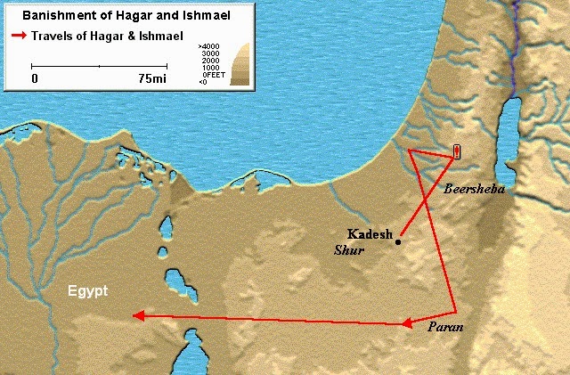 We heard a story today about how Abraham’s wife Sarah, old and thought to be barren, gave birth to Isaac, who grew up and became the father of Jacob who was renamed “Israel”. He is considered to be the patriarch of the Jewish nation. However, Isaac was not the only son of Abraham, nor his first son. Before Isaac was born, Abraham and Sarah, frustrated that Sarah was barren, agreed Abraham would have a relationship with Hagar, Sarah’s maidservant. Hagar gave birth to Ishmael. This all happened before monogamy became the predominant form of marriage. Multiple relationships were not unusual in Abraham’s day. However, human nature being what it is, anytime you have a love triangle with two women and one man, you’re eventually going to have jealousy. Sarah got mad and insisted Abraham kick Hagar and Ishmael out of the house, because Isaac had become her favorite son. Sarah said, and I quote, ““Drive out that slave and her son! No son of that slave is going to share an inheritance with my son Isaac!” Now, Abraham was a bit distressed, but God told Abraham to obey Sarah no matter what she asked of him. (My advice to all married men, based on experience: do whatever your wife asks of you. In my own life, what Beeper wants, Beeper gets). But just like God told Abraham a nation would spring from Isaac, God said also a nation would come from Ishmael. So Abraham sent Ishmael and Hagar into the wilderness. But they did not perish. God provided water for them when they were thirsty, and Hagar found Ishmael a wife when they reached Egypt, after reminding Hagar again that a great nation will come from Ishmael. I’ve put up a map so you can see the route they took.